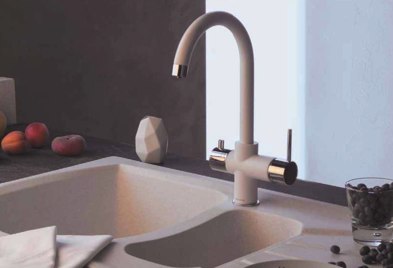 PURA è un sistema brevettato costituito da un rubinetto che incorpora due getti, uno centrale per l’acqua Pura filtrata pronta da bere ed uno perimetrale che eroga acqua domestica.