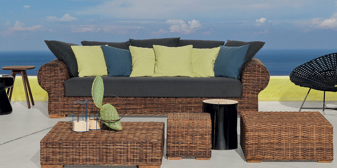 Il nostro consiglio è quello di rimanere su colori che richiamino sempre la natura. In questo caso vi consigliamo come materiali il rattan per le strutture dei tavolini, dei pouf e divani con coperture in lino o cotone per i cuscini e le sedute. Un eccellente esempio è la collezione CROCO di GERVASONI che possiamo vedere rappresentata nell’immagine qui sotto.
