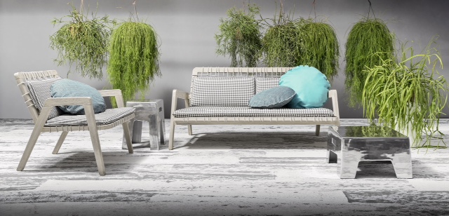 Il materiale è il teak invecchiato e la corda in pvc intrecciata con trama larga e irregolare. Poltrona e divano hanno seduta e cuscini schienale da 45 cm realizzati con imbottitura idrorepellente e rivestimento completamente sfoderabile.