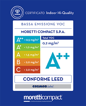 L’etichetta COSMOB label, attesta e garantisce l’esatto livello di emissioni che un determinato prodotto immette nell’ambiente. La sensibilità posta dall’azienda nei confronti di importanti tematiche, come salute e rispetto per l’ambiente, è testimoniata anche dall’ottimo risultato ottenuto nelle analisi di laboratorio, le quali hanno permesso di collocare i prodotti Moretti Compact nella classe meno emissiva A++.Inquinamento indoor