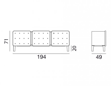 Mobile contenitore in noce, tre ante tessili, due ripiani interni regolabili. Piedi in noce con terminale in acciaio spazzolato. Finiture struttura: noce canaletto verniciato naturale, laccato opaco bianco, grigio, avio, nero.