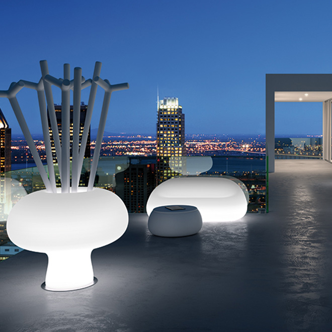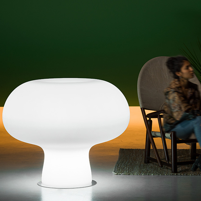 Abbinato al vaso “Harbo” può creare delle ambientazioni di grande impatto emozionale, rievocando un prato di grandi fiori fuori scala. In versione luminosa, è adatto a creare dei grandi punti luce in ambienti indoor sia classici che contemporanei, ma anche per arredare giardini, terrazzi, portici o spazi aperti. Necessita di base di stabilizzazione o stabilizzazione e fissaggio.