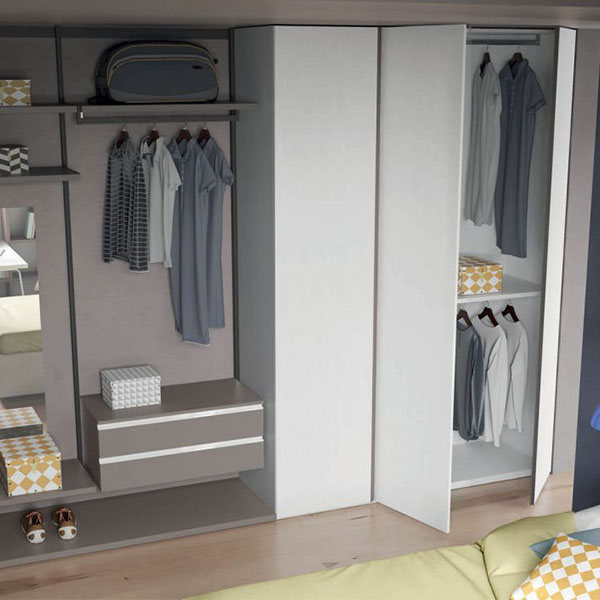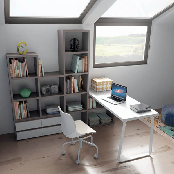 Cameretta con letto a terra imbottito, testiera liscia in tessuto.