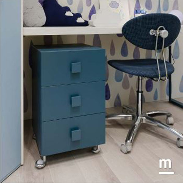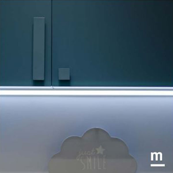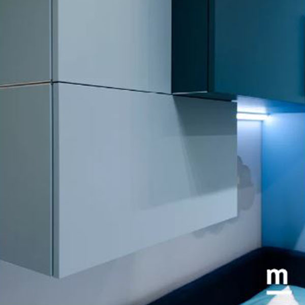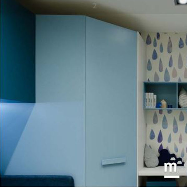 Una soluzione che non ti aspetti. È il frutto dell’abbinamento di wallbox che giocano con le profondità diverse e i colori laccati sulle tonalità del blu. Il grande wallbox sospeso sopra il letto (con profondità 53.6 cm) può essere attrezzato all’interno, grazie alla maggiore profondità, con tubo appendiabiti. È una favola che diventa realtà.