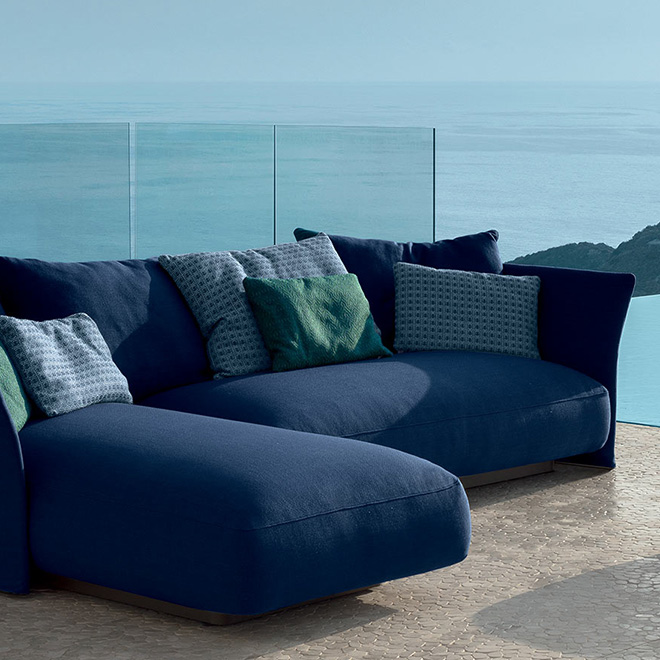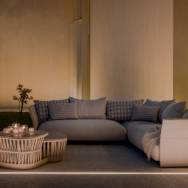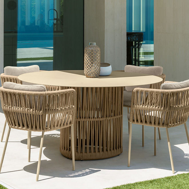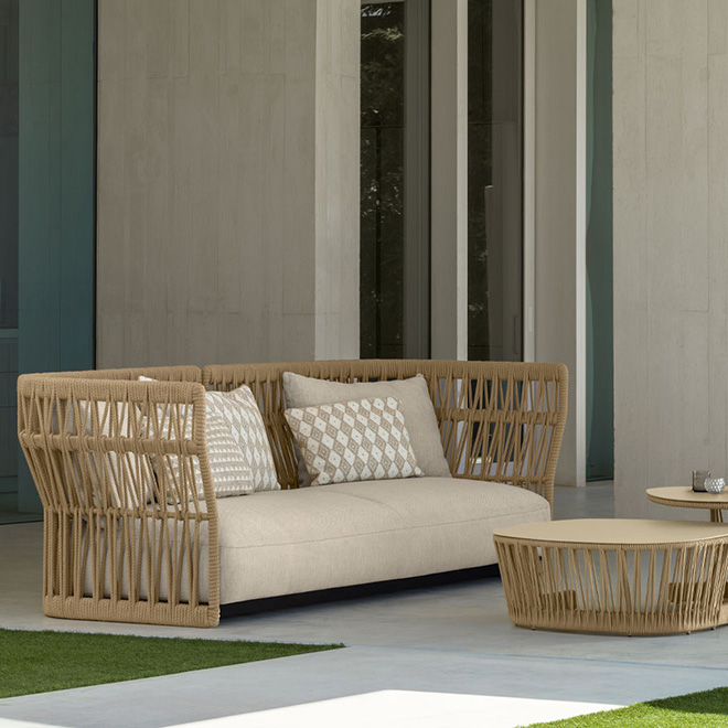 Divano modulare, Divano con schienale in corda o in tessuto, Poltrona Linving, Poltrona lounge in corda o in tessuto, Pouf, Lettino, Tavoli da caffè di diverse misure (Small, Medium o Big), Altalena, Tavoli da prando in diverse dimensioni (Rettangolari/quadrati: 150 x 150, 240/300 x 100; Rotondo: D140)