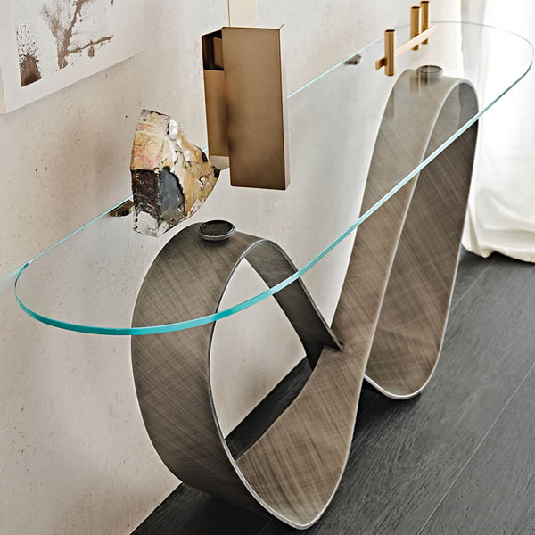 Nel modello Butterfly Consolle il piano in vetro è proposto in una forma inedita dai lati arrotondati, le cui proporzioni nascono dal design armonico della base.