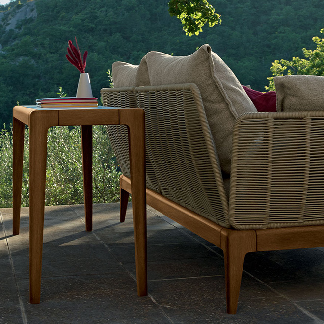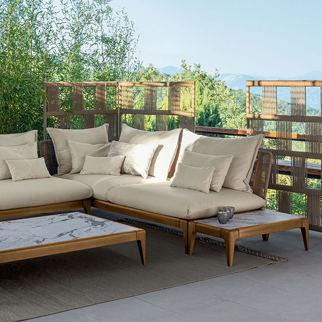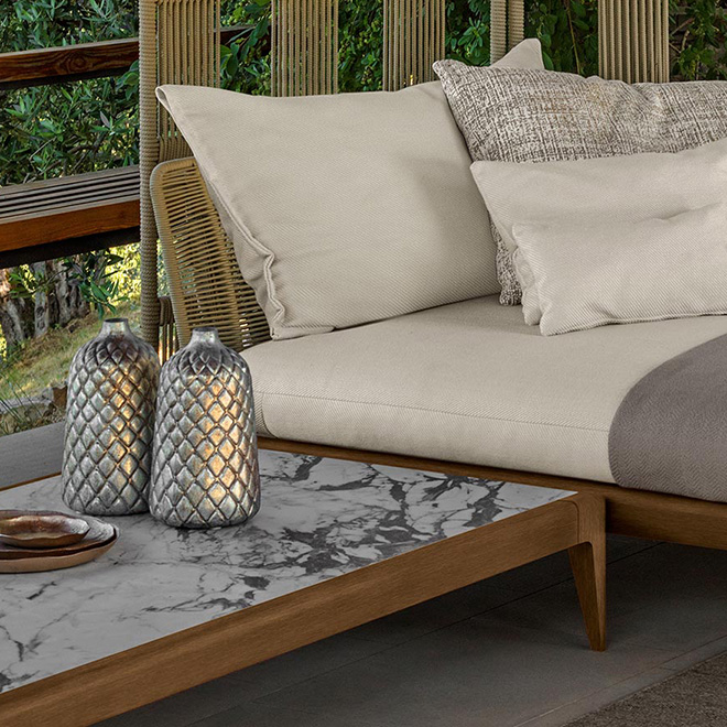 Divano 3 posti, Divano modulare, Poltrona Linving, Pouf (150 x 150), Tavoli da caffè di diverse misure (45 x 90, 160 x 90), Lettino, Sedie e Tavolo da pranzo (240 x 110) ed infine la Consolle (160 x 40).
