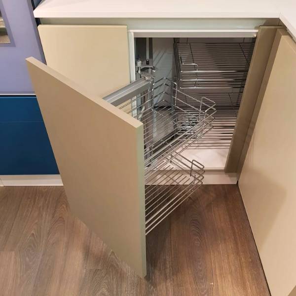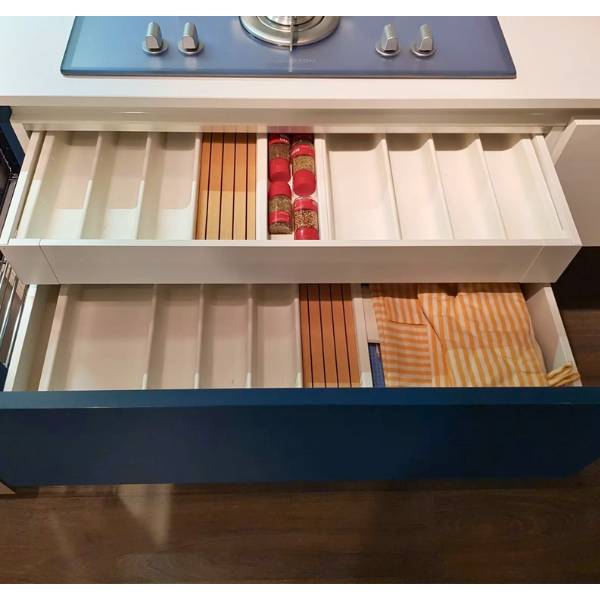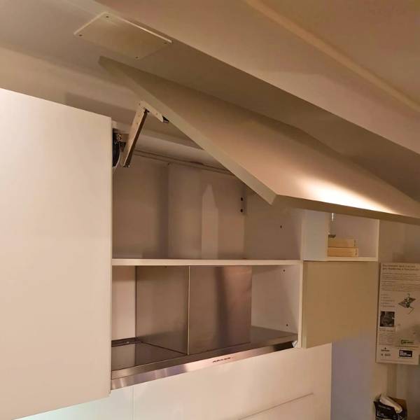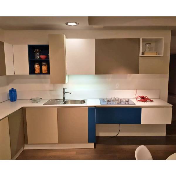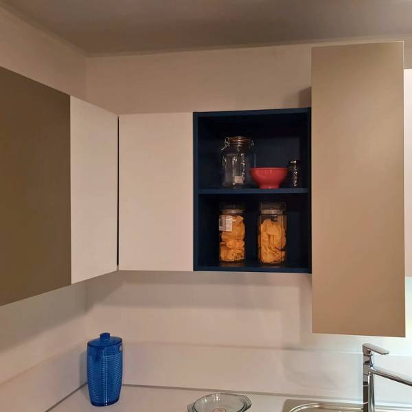 Cucina con frontali in lamitec opaco colori fango, silicio, petrol e bianco. Basi sospese, pensili con prfondita’ variabile cm.34/45, aperture battente, vasistas e basculante, basi estraibili con cesti e cassetti interni attrezzati. Colonna firgorifero e forni. Dimensioni cm.350x263x219/2403