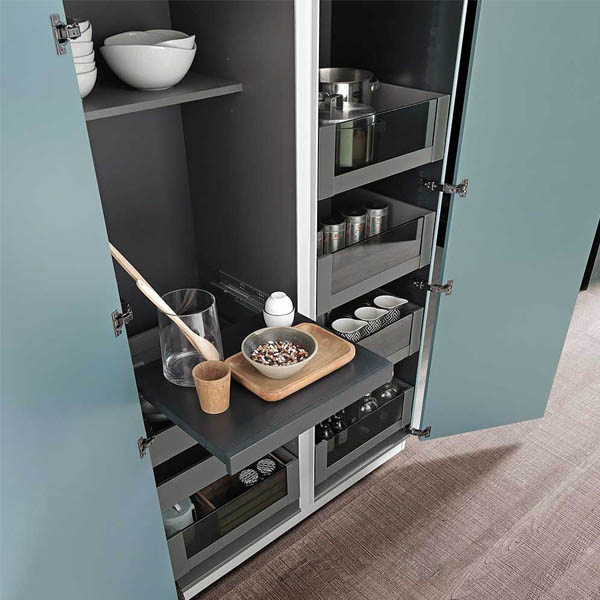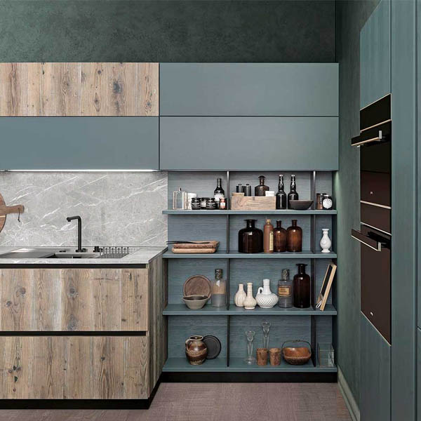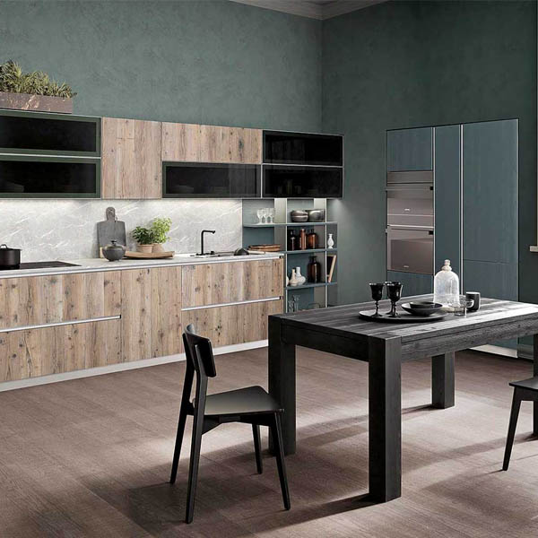 Una cucina elegante, con finiture in abete saponato antico e petrolio laccato che richiamano le delicate tonalità della natura.