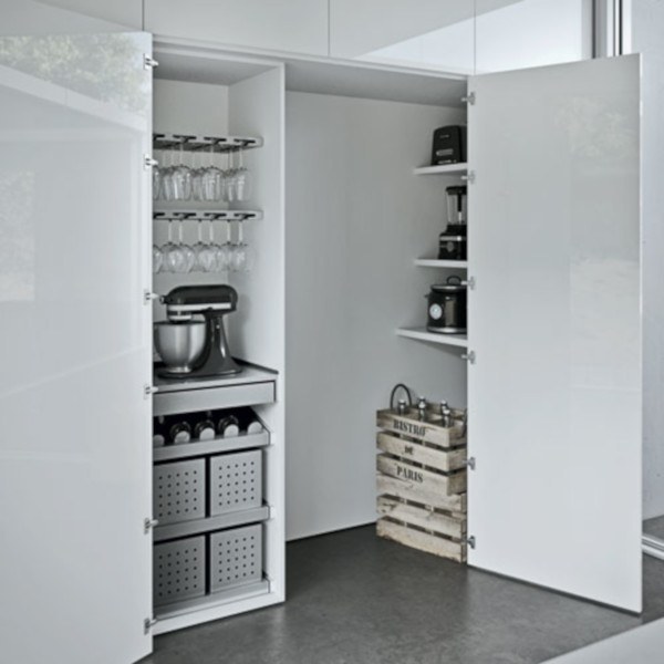 Il modulo Cabina Angolo Dispensa può essere attrezzato con accessori di vario genere, l’assenza del fondo e l’apertura a 155° delle ante permettono l’accesso diretto al suo interno, la larghezza è stata progettata per contenere anche una lavatrice e facilitarne le operazioni di carico e scarico, l’impiego di alcuni accessori fissati sulla parete di fondo permette di sfruttare lo spazio in modo ottimale
