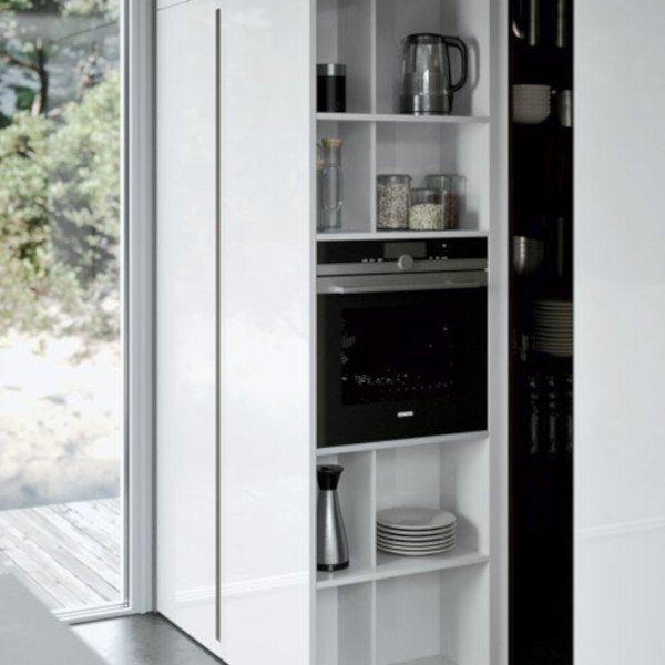 Il modulo laterale a giorno è predisposto per l’inserimento di forno elettrico, microonde, cantina vino ed è utilizzabile anche come libreria o portaoggetti.