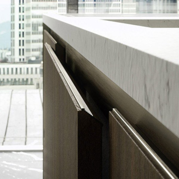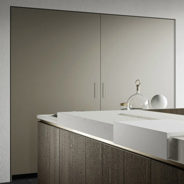 L’anta in finitura Eucalipto Termocotto ha un bordo superiore inclinato a 30° sul quale viene inserita nella parte interna la maniglia “Grip”, che serve per proteggere l’anta stessa ed aumentare la prensilità.