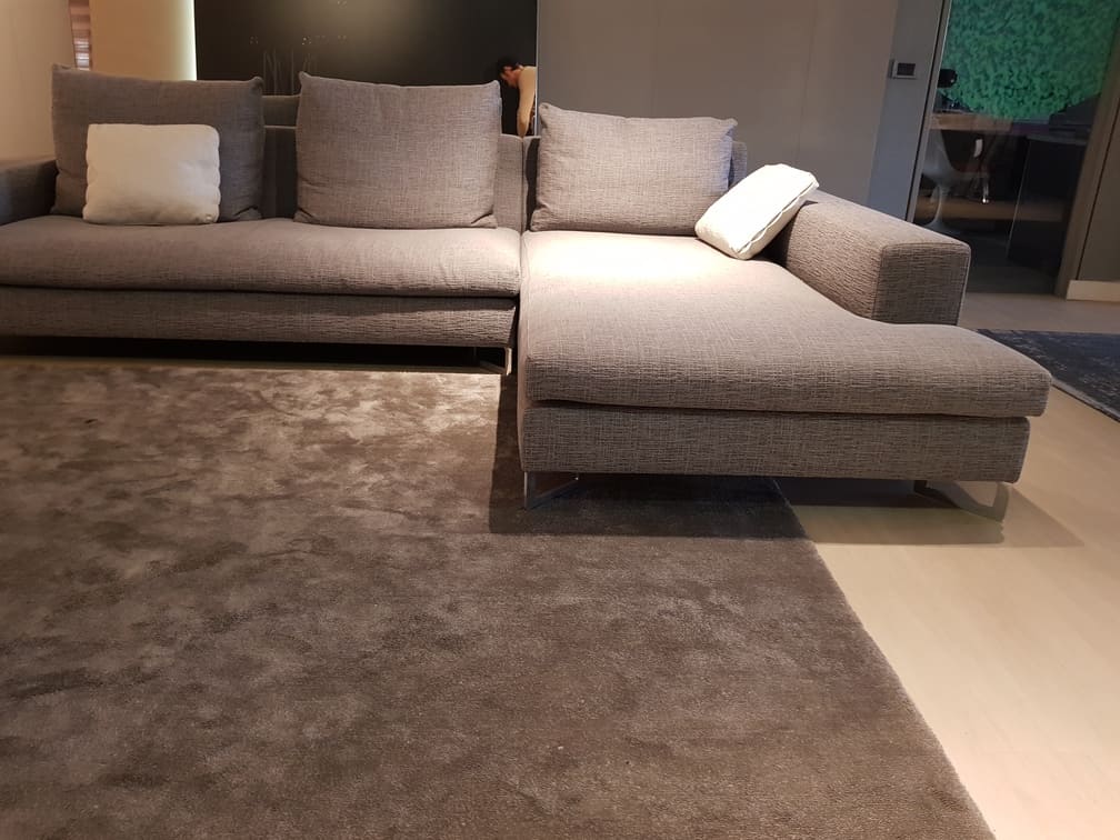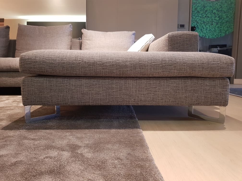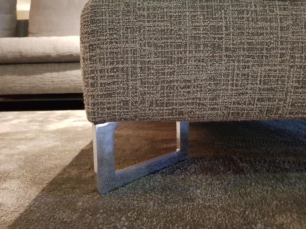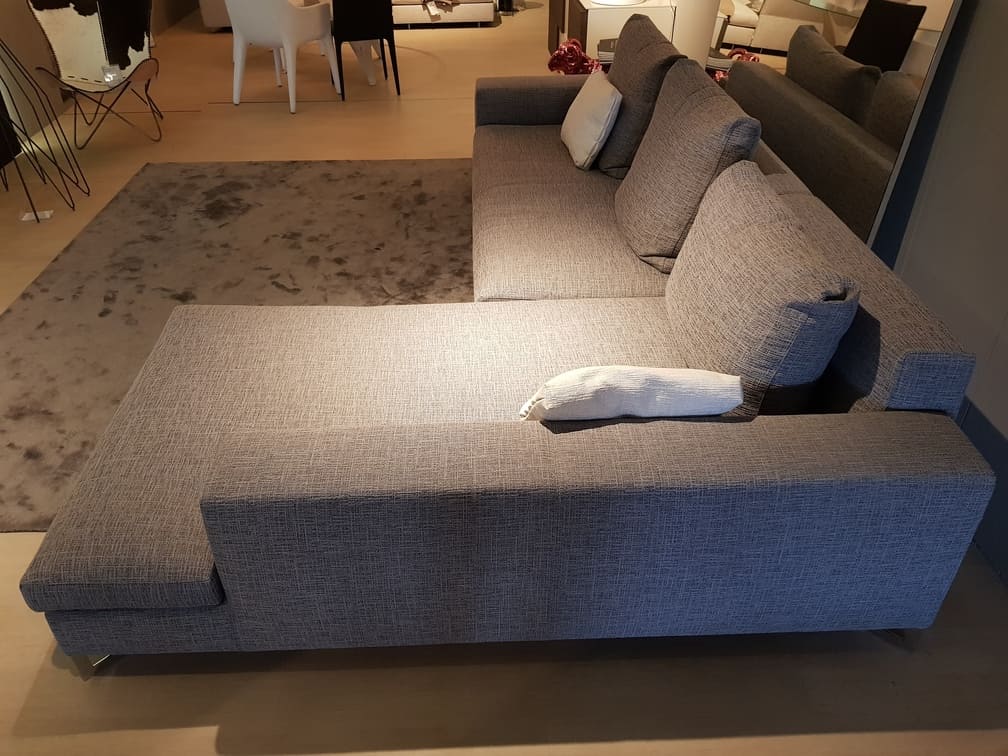 Sistema di divani fissi o componibili caratterizzati da volumi equilibrati e proporzioni generose, con cuscino sedile unico di nuova concezione, piuma ecomemory, migliorativo del comfort di seduta, della manutenzione e dell’aspetto estetico. Rivestimento in tessuto grigio melange cat.K 9790, piedini in acciaio cromato piegato e tagliato al laser, con appoggi a terra in materiale plastico antiscivolo. Telaio in legno massello di abete, imbottitura a densità variabile con poliuretano, piuma sterilizzata e cotone. Completamente sfoderabile