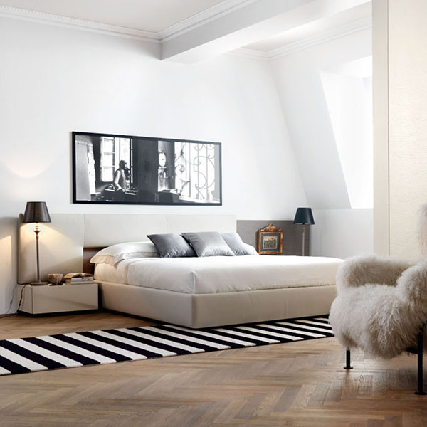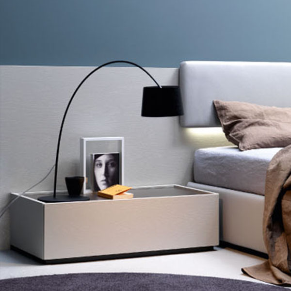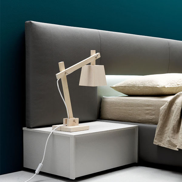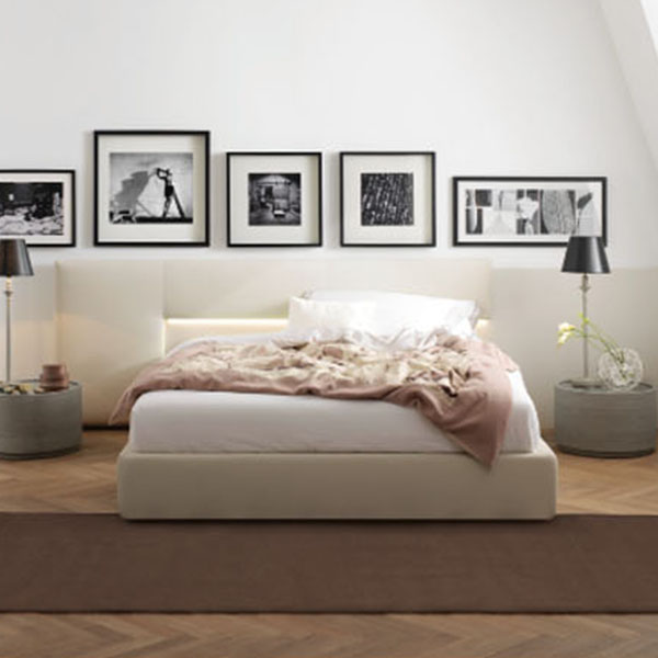 Dedalo è composto da un’architettura di elementi che coniugano ergonomia, praticità ed estetica. La combinazione tra il pannello in legno spessore 30 mm ed il giroletto imbottito con materasso a filo, riducono l’ingombro garantendo massimo comfort nel minimo spazio. Un pannello ad “elle” imbottito diviene comoda testiera attrezzata da scenografiche luci a Led, per favorire la lettura in un’atmosfera suggestiva. Due le tipologie disponibili: “A” pannello imbottito a terra, “B” pannello imbottito sovrapposto al comodino.