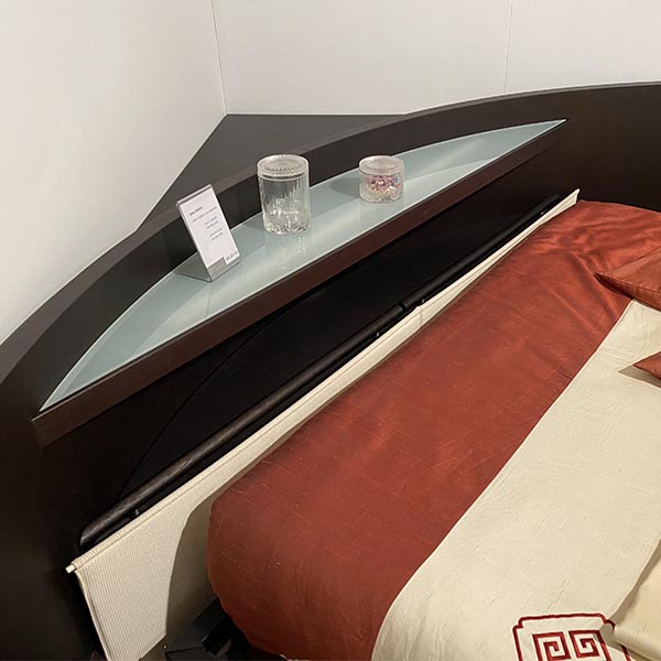 Letto ad angolo in rovere moro composto da triangolo angolare, schienale curvo con mensola in vetro acidato, comodini fissi con cassetti apribili a mezzaluna, due testate estraibili in tessuto, due vani posteriori porta cuscini con maniglione