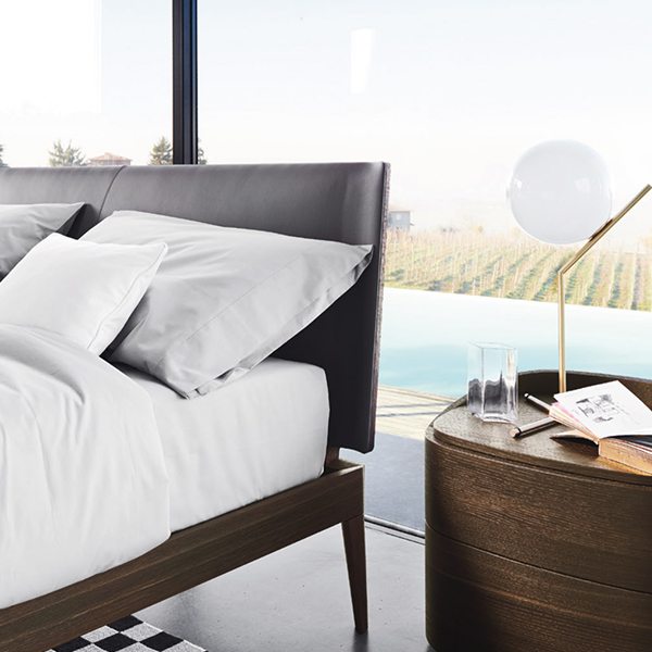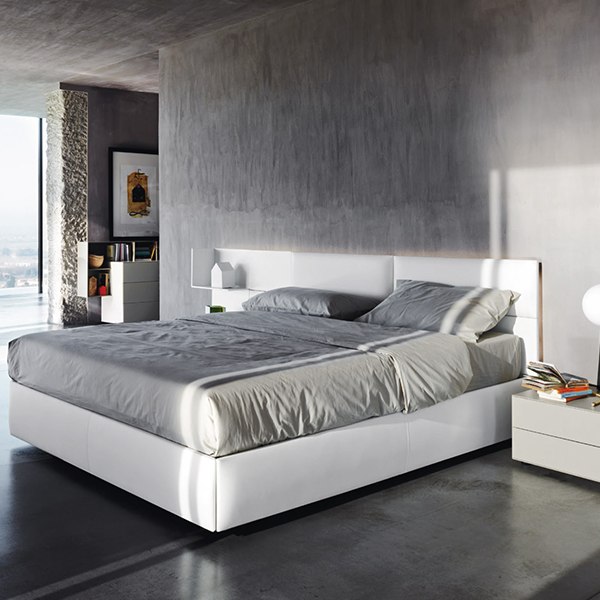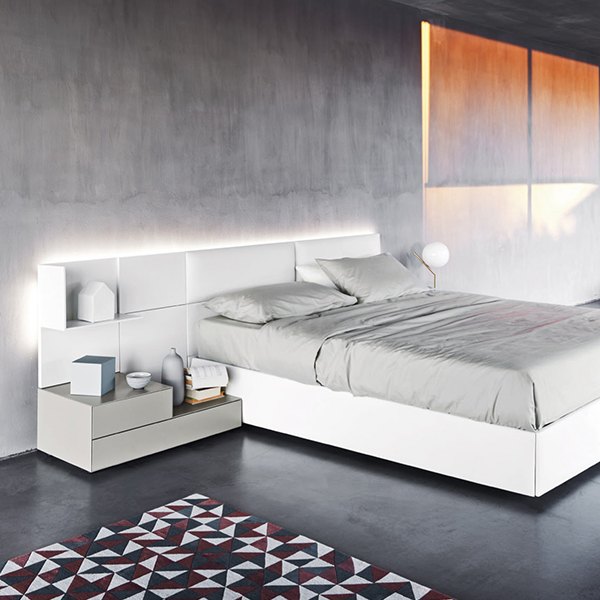 Ecletto, ovvero un eclettico sistema letto caratterizzato dalla testata composta da pannelli imbottiti o in legno, anche in abbinamento a contenitori ed elementi a giorno. Sviluppati sulla modularità di un quadrato di 300 mm di lato, i pannelli possono essere liberamente posizionati sia in verticale che in orizzontale, anche variandone la disposizione nel tempo. Da questo semplice concetto nasce una grandissima flessibilità nella progettazione che si estende all’inserimento di cassettiere, con giunzione della scocca a 45° e apertura push-pull, nonché di elementi a giorno, sempre modulari. Un retropannello forato unifica la composizione e permette di inserire un impianto a led lungo il perimetro della testiera, creando un affascinante effetto di illuminazione.