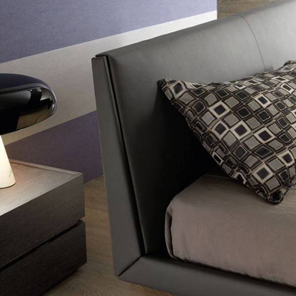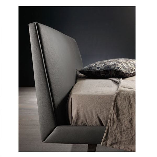 Testiera e giroletto sono rivestiti da una confortevole imbottitura e da pelle pregiata che avvolge ogni singolo elemento rievocando le confezioni degli arredi anni “50”. La loro congiunzione a 45° oltre ad essere funzione diviene segno distintivo di questa collezione