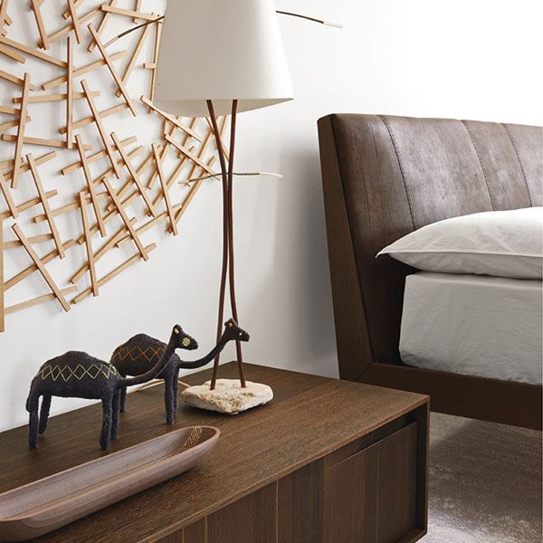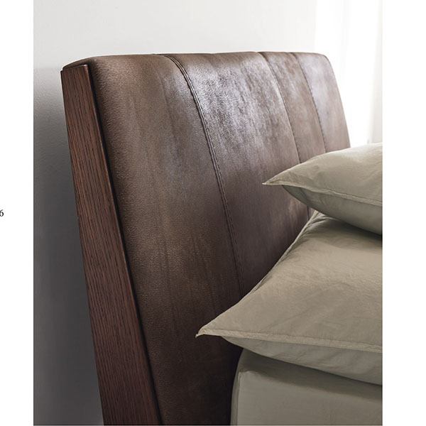 In questa versione, il letto Febo evidenzia la sua predisposizione ad integrare diversi materiali. Il legno incornicia la pelle vintage oppure, a scelta, la pelle o l’ecopelle, che riveste la testiera resa accogliente ed ergonomica da una generosa imbottitura, realizzata con lavorazioni di qualità sartoriale. I piedi del letto, dalla forma caratterizzante, sono in metallo con finitura brown o titanio