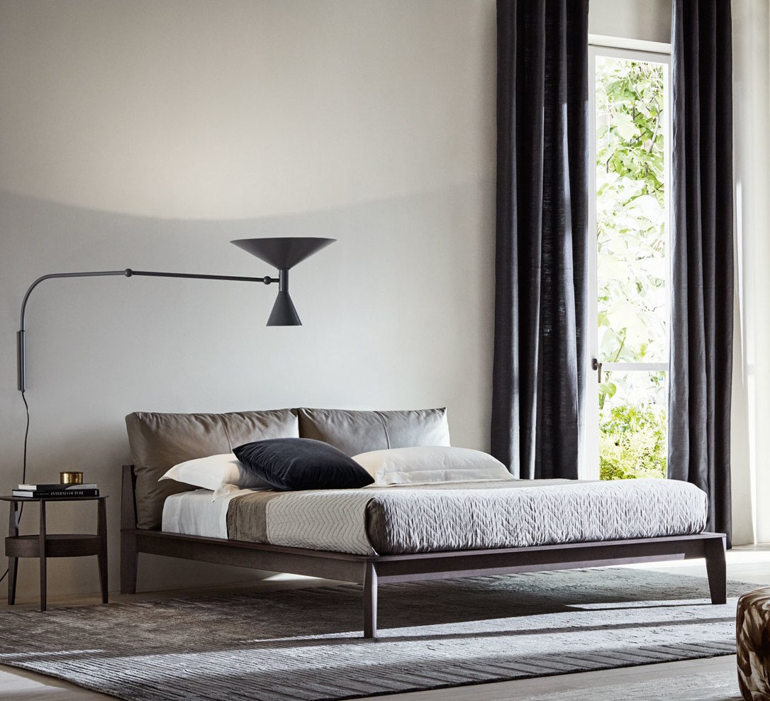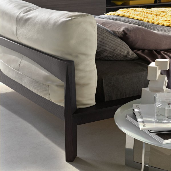 Morbidi cuscini per la testata in tessuto o pelle si combinano con i legni: rovere grigio, rovere nero, olmo chiaro o olmo scuro (parti in massello di rovere tinto). La versione eucalipto è realizzata in massello e tranciato tinto.