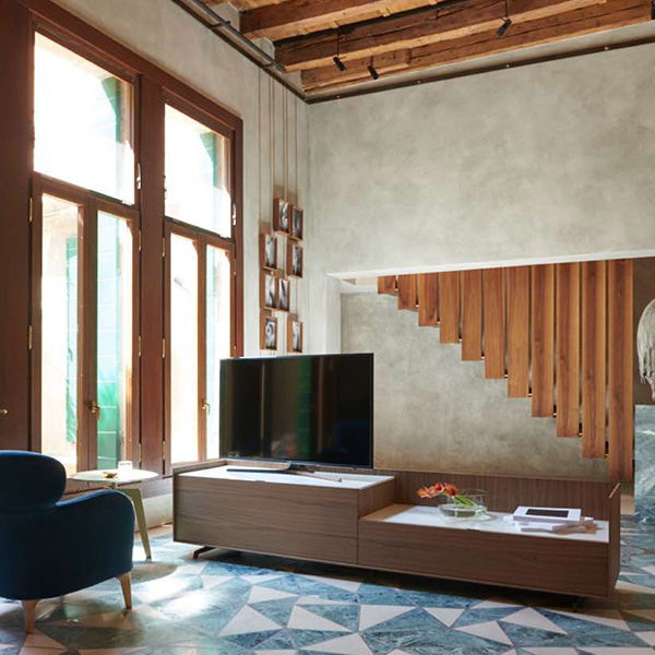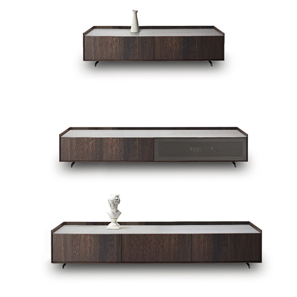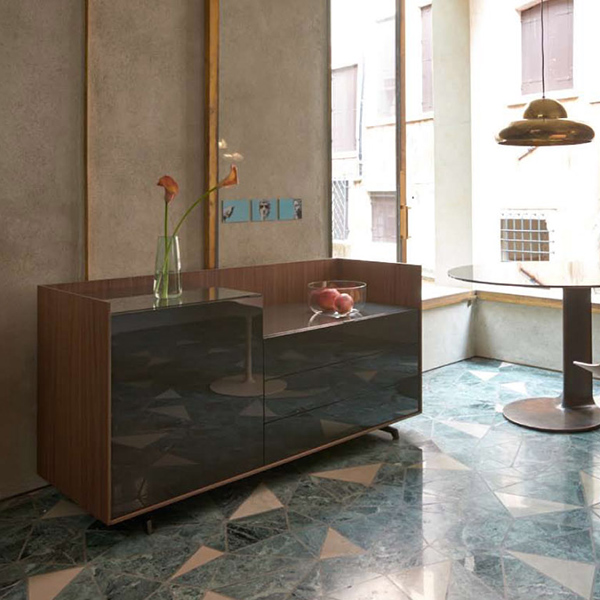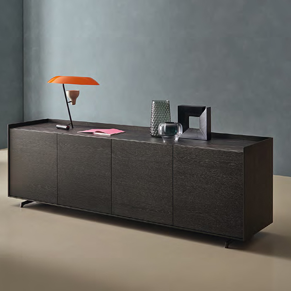 Circondato da un perimetro sottile sul retro e sui fianchi, alto 10 mm, il top della madia Cabaret può essere in tinta con la struttura oppure avere una finitura diversa. Rifinite su tutti i lati possono essere posizionate anche a centro stanza, oppure collocate dietro allo schienale di un divano.