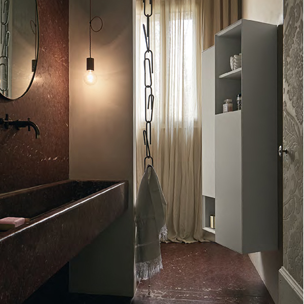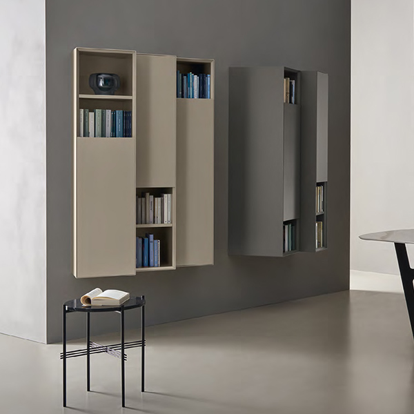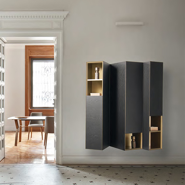 Caratterizzati dalla scocca con unioni a 45° e frontali sagomati con la stessa angolazione, i contenitori Domino possono essere interpretati come elementi singoli o componibili a piacere. Un progetto dinamico che si presta alle più diverse composizioni di colori e volumi. La versatilità e la modularità di questi elementi, si presta a completare efficacemente anche altre situazioni oltre allo spazio giorno: ad esempio una zona di disimpegno oppure un ambiente bagno.