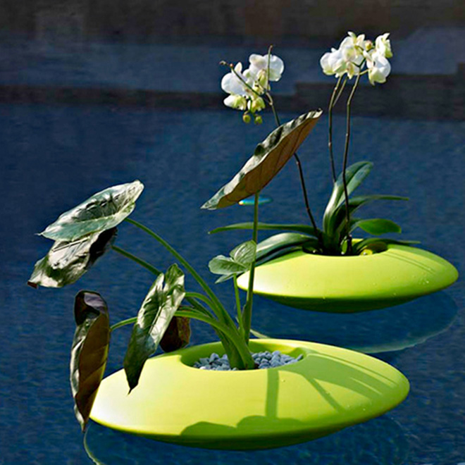 Vaso galleggiante disponibile in due formati. Ideale per spazi esterni che presentano specchi naturali o artificiali.