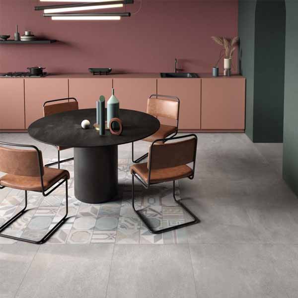 L’effetto industriale del cemento incontra le texture policrome dei terrazzi veneziani, in un mix compositivo decisamente contemporaneo.