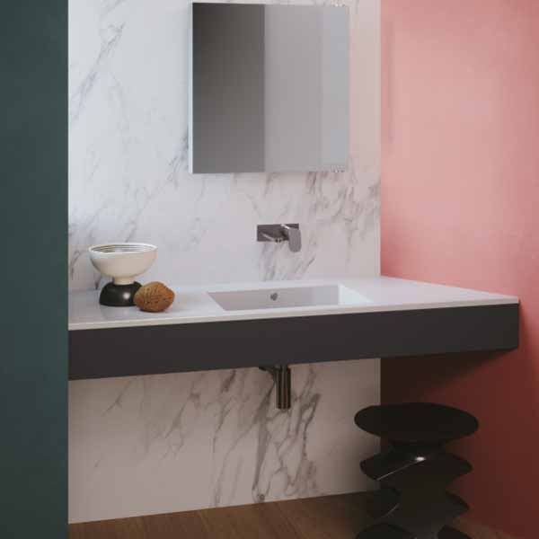 È un lavabo che interpreta a pieno la filosofia Bespoke di Azzurra. L’idea è quella di un piano ceramico unico e monomaterico con bacino integrato che, oltre ai cinque formati in catalogo, prevede la versione personalizzabile attraverso tagli ortogonali o diagonali. Il carattere grafico e squadrato delle linee è completato dalla struttura sottolavabo in metallo versione antracite o bianco.