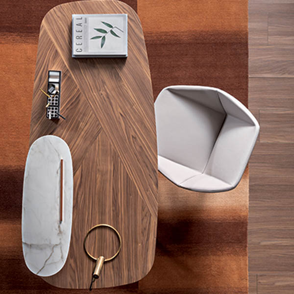 Lo scrittoio Gauss è caratterizzato dalla fluidità e armonia delle linee: il piano curvilineo è morbido e senza spigoli, così come le gambe che lo sorreggono, presentandosi come anelli metallici dagli angoli arrotondati.Il ripiano crea due livelli di sviluppo del prodotto: oltre al piano principale in legno, lo scrittoio può essere dotato di una funzionale mensola “sospesa” in ceramica, attaccata al piano tramite due asticelle metalliche. Altra particolarità è la forma delle gambe che, disposte in modo asimmetricamente dinamico, creano una struttura irregolare che conferisce un aspetto giovane e disinvolto alla figura. Inoltre, le venature del legno del piano generano dinamicità grafica e aumentano il valore estetico di Gauss.