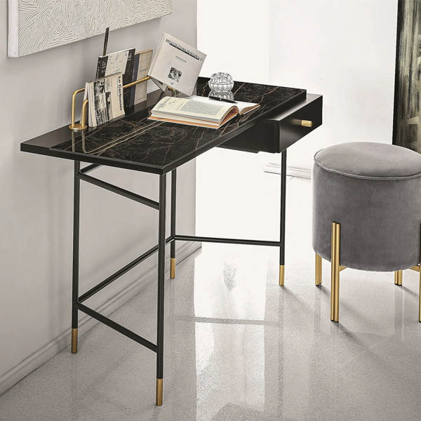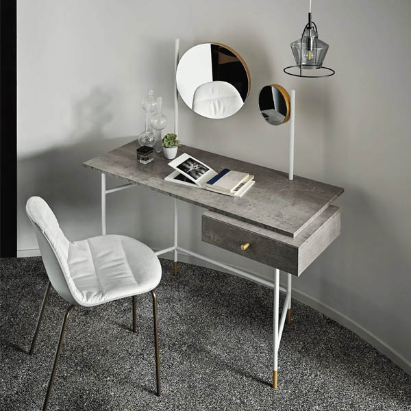 Scrittoio in versione con specchio e luce orientabili, solo specchio o solo scrittoio. struttura in Acciaio laccato. Dettagli decorativi (piedini, maniglia cassetto e supporti specchio e luce) in Acciaio laccato. Piano e cassetto in melaminico.